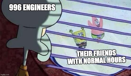 Nuanced perspective on it from Tom Hammer from a16z. “…if you think the idea of working 996 is preposterous / “no one actually does that”, it’s possible you’ve just never had a job you truly love, that you feel really matters.